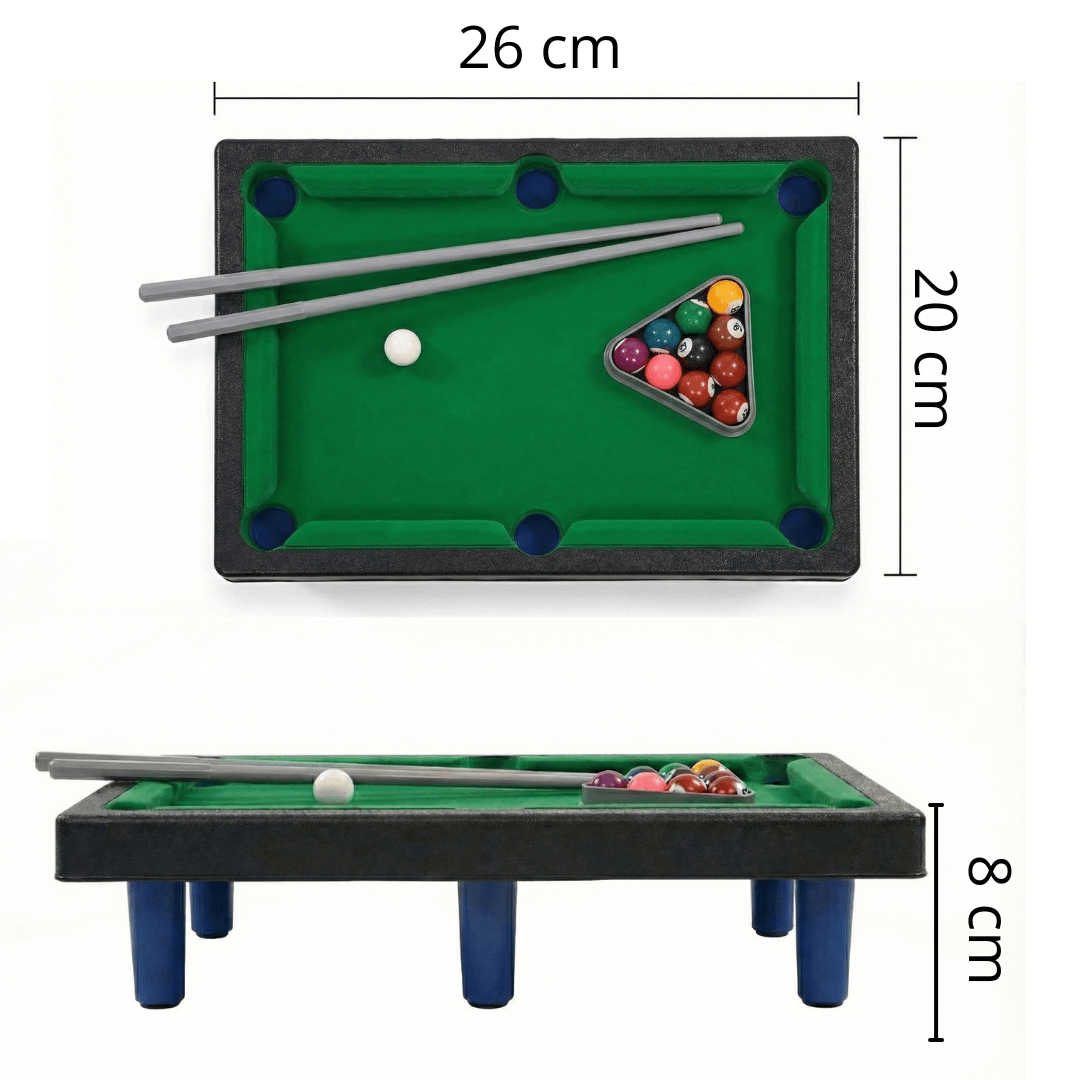 1 mini mesa de billar + 6 patas de mesa + 11 bolas + 1 triángulo organizador + 2 tacos de mini billar.