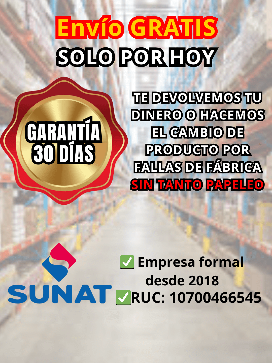 Queremos que esté completamente satisfecho con su compra y por eso ofrecemos una garantía de 30 días por fallas de fábrica.